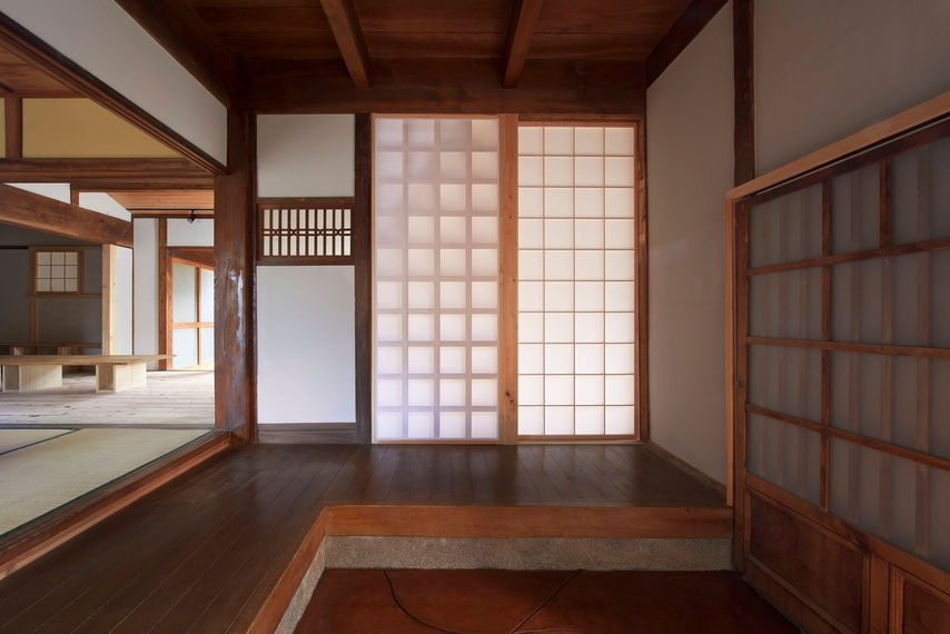 そこで今回の改修では、限界耐力計算にもとづき、礎石建ての基礎を残すなど伝統構法を生かす耐震補強を行った。耐力壁になる格子壁を使うことで開放性を維持し、障子紙を通したやわらかな光で民家の魅力を取り戻している。
